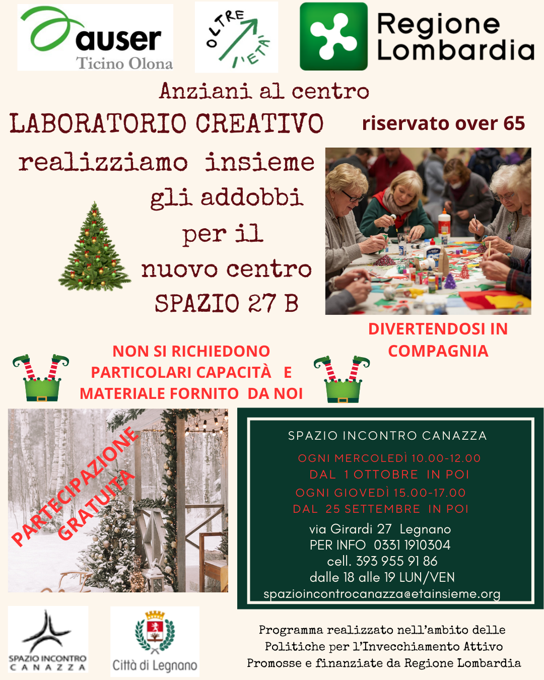 Dall'1 ottobre, ogni mercoledì dalle 10 alle 12 e ogni giovedì dalle 15 alle 17 si tiene il laboratorio creativo per realizzare gli addobbi natalizi con cui sarà decorato lo Spazio 27/B. Il laboratorio è riservato alle persone dai 65 anni in su ed è un'iniziativa realizzata nell'ambito delle Politiche per l'invecchiamento attivo promosse e finanziate dalla Regione Lombardia.