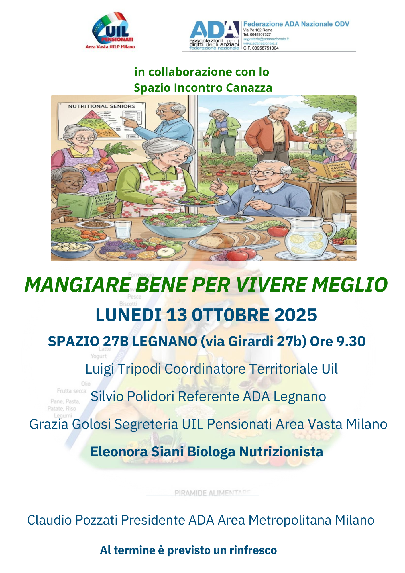 Lunedì 13 ottobre alle 9.30 allo Spazio 27/B di via Girardi si terrà "Mangiare bene per vivere meglio", incontro con la nutrizionista Eleonora Siani. L'evento è orgnizzato da UIL pensionati, Federazione ADA in collaborazione con lo Spazio Incontro Canazza. Saranno presenti Luigi Tripodi, coordinatore territoriale UIL; Silvio Polidori, referente ADA Legnano; Grazia Golosi, segreteria UIL Pensionati Area Vasta Milano e Claudio Pozzati, presidente ADA Area Metropolitana Milano.
