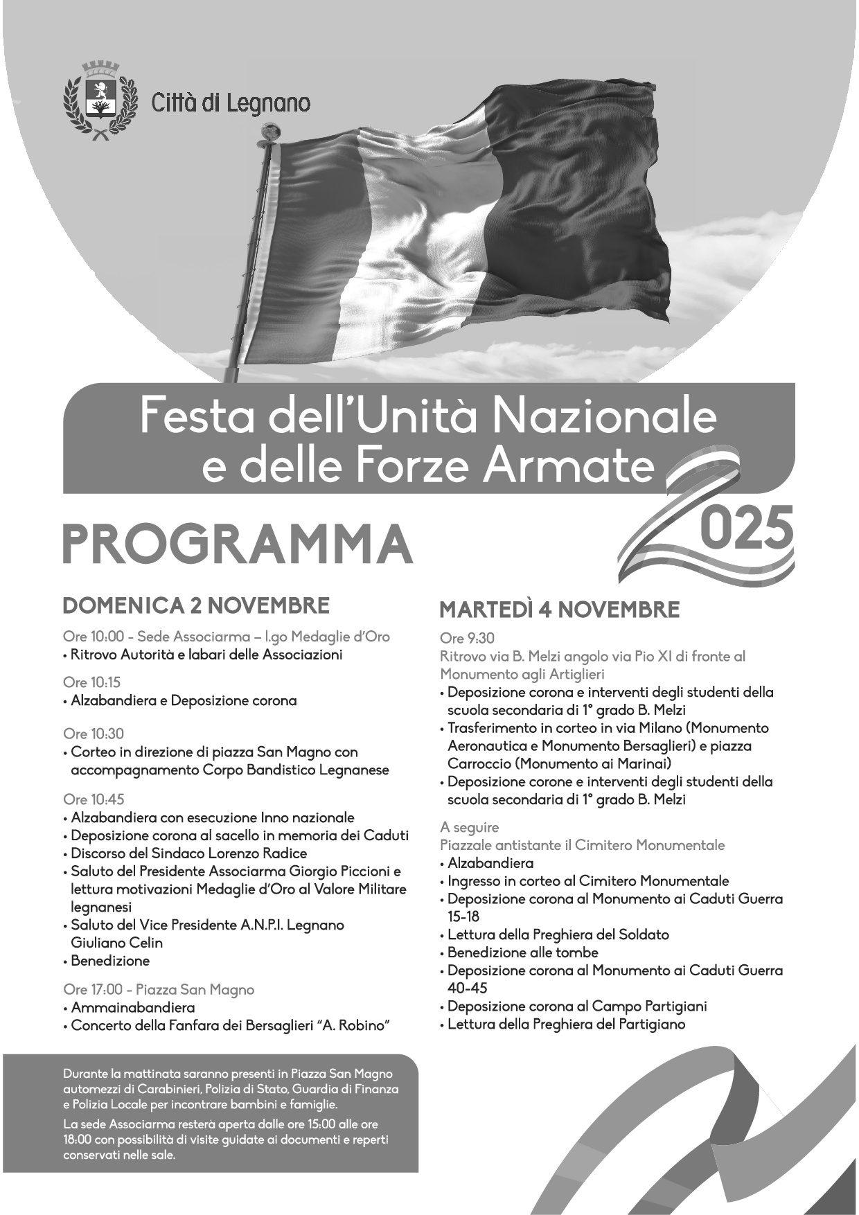 L'Amministrazione comunale invita tutta la cittadinanza alle celebrazioni organizzate per le giornate del 2 e 4 Novembre 2025 per la Festa dell'Unità Nazionale e delle Forze Armate come da programma allegato.