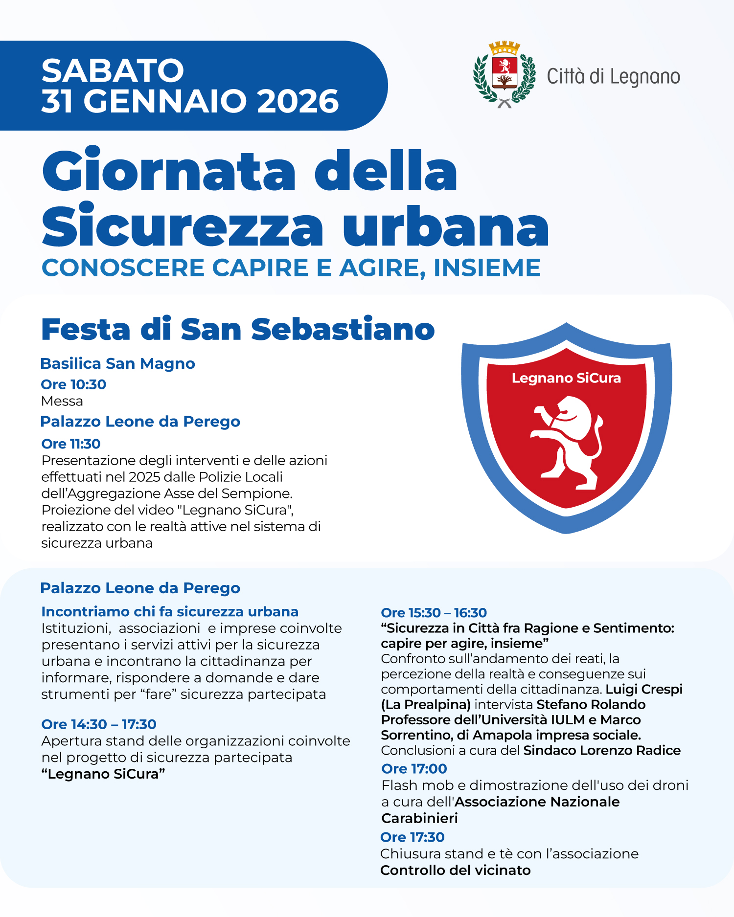 Sabato 31 gennaio sarà la Giornata della Sicurezza urbana. Due i momenti: al mattino, in basilica e, a seguire a Palazzo Leone da Perego, si celebra la Festa di San Sebastiano, patrono della Polizia locale. Nel pomeriggio, a partire dalle 14.30, a Palazzo Leone da Perego, stand delle associazioni che partecipano al progetto "Legnano SiCura", confronto fra esperti sul tema della Sicurezza urbana, flash mob con dimostrazione dell'uso del drone da parte dell'ANC e incontro con l'associazione Controllo del vicinato.